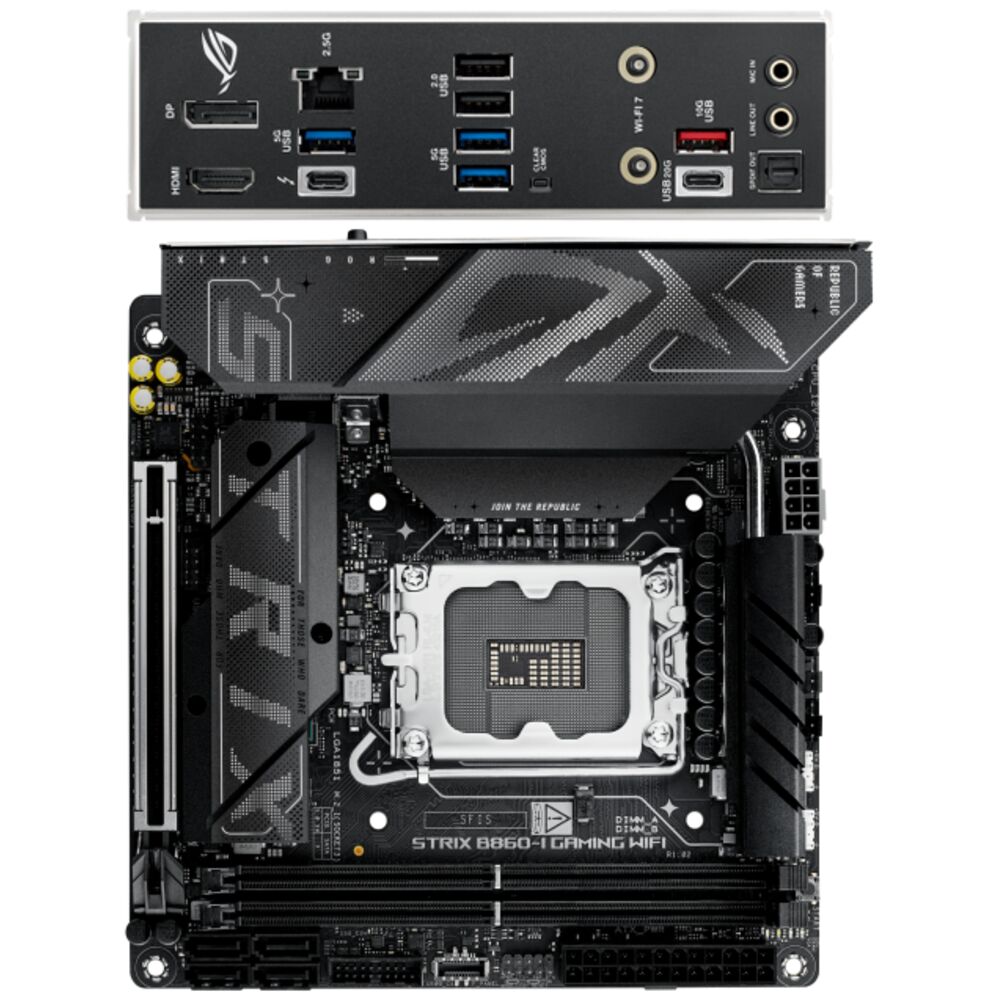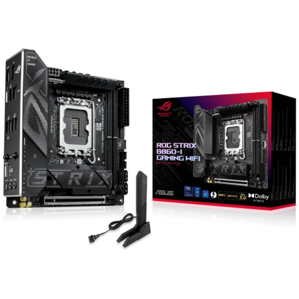 Материнская плата ASUS ROG Strix B860-I Gaming WiFi B860 Soc-1851 2xDDR5, 4xSATA3, RAID, 2хM.2, 1xPCI-E16x, 4xUSB3.2, 2xUSB3.2 Type C, DP, HDMI, WiFi, 2.5Glan, Mini-ITX